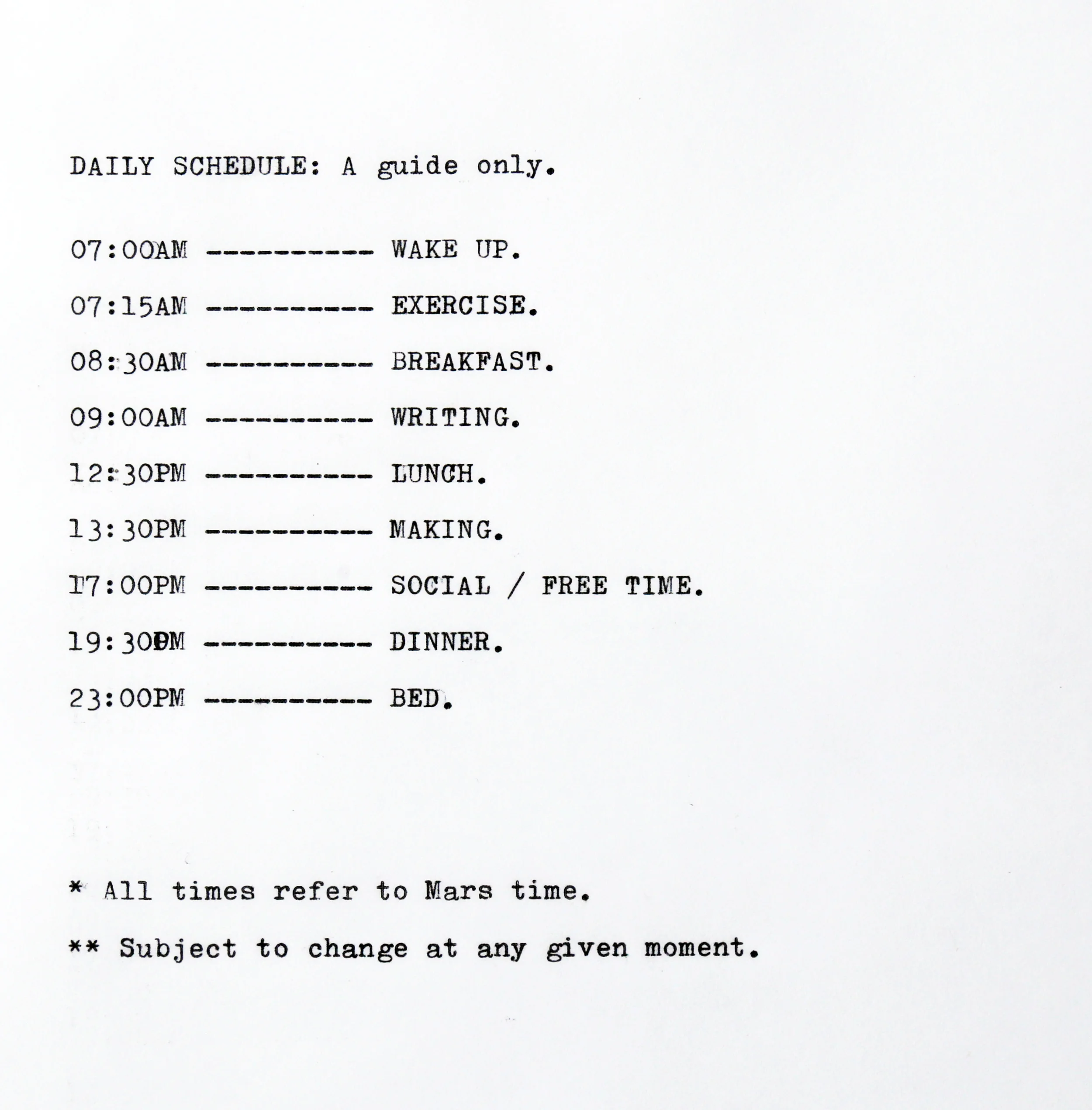 Of all the possible rule I could set for myself the only one etched in stone is that I must always abide by my Mars local time. This means irrespective of activity or occasion I must only undertake actions that conform to my time on Mars and I must encourage other to do so. In reality this would mean that I eat breakfast during my morning regardless the time on Earth, and should I be accompanied by other people during a meal or activity I would request that they abide by my time also.